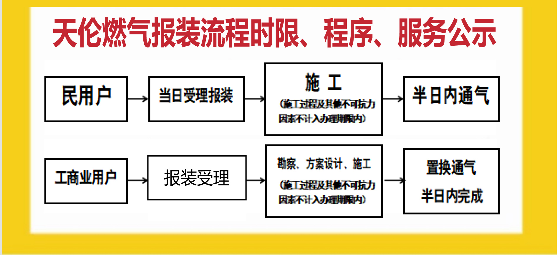 工商業(yè)用戶:用戶報(bào)裝受理半日內(nèi)辦結(jié),勘察、方案設(shè)計(jì)、施工、置換通氣半日內(nèi)完成(施工過程及其它不可抗力因素不計(jì)入辦理期限內(nèi))。